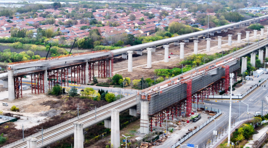 图为11月16日由中铁十局承建的济(南)青(岛)高铁潍东上行联络线跨潍坊市蓝天路连续梁完成合龙施工。