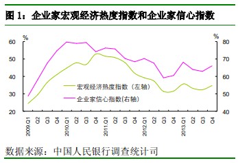 新华网消息 中国人民银行今日发布2013年第4季度企业家问卷调查报告,报告显示,企业家宏观经济热度指数为34.7%,较上季上升2.2个百分点,较去年同期上升3.1个百分点;企业家信心指数为65.9%,较上季上升3.1个百分点,较去年同期上升5.5个百分点。