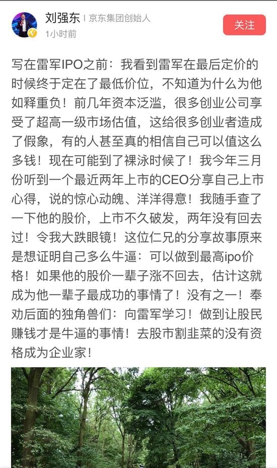 京东集团创始人刘强东发文称,看到雷军在最后定价的时候终于定在了最低价位,不知道为什么为他如释重负。前几年资本泛滥,很多创业公司享受了超高一级市场估值,这给很多创业者造成了假象,有的人甚至真的相信自己可以值这么多钱。奉劝后面的拟上市公司们:向雷军学习,去股市割韭菜的没有资格成为企业家。