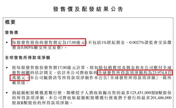 国际配售部分共收到23.98亿股认购,相当于国际配售可供认购股数的110%。
