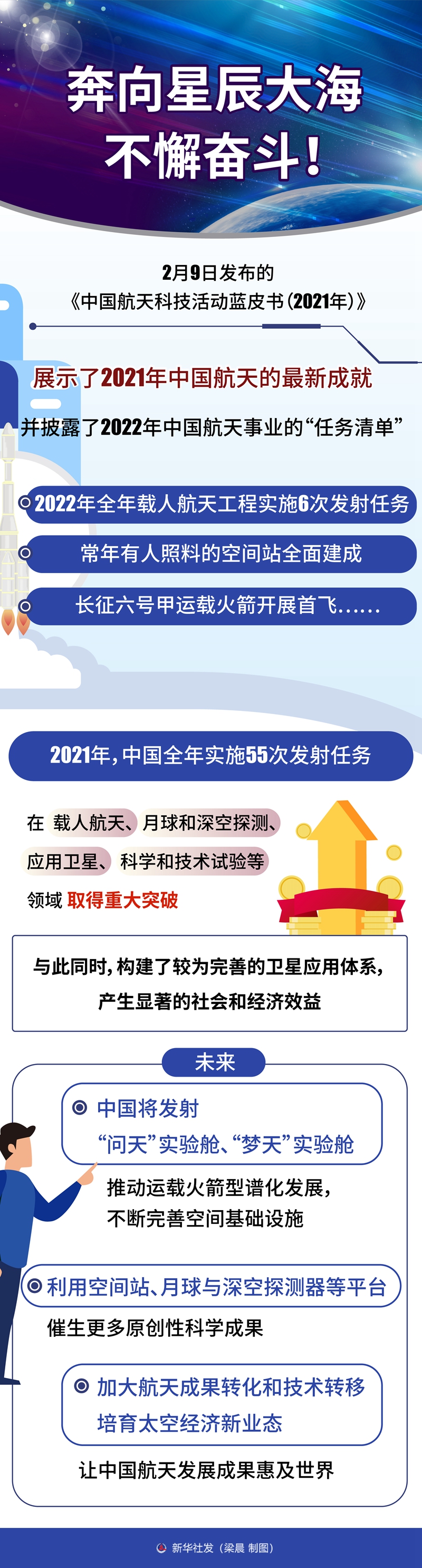 2022年全年载人航天工程实施6次发射任务,常年有人照料的空间站全面建成,长征六号甲运载火箭开展首飞……9日发布的《中国航天科技活动蓝皮书(2021年)》,展示了2021年中国航天的最新成就,并披露了2022年中国航天事业的“任务清单”,一项项举世瞩目的成就和新计划催人奋进。
