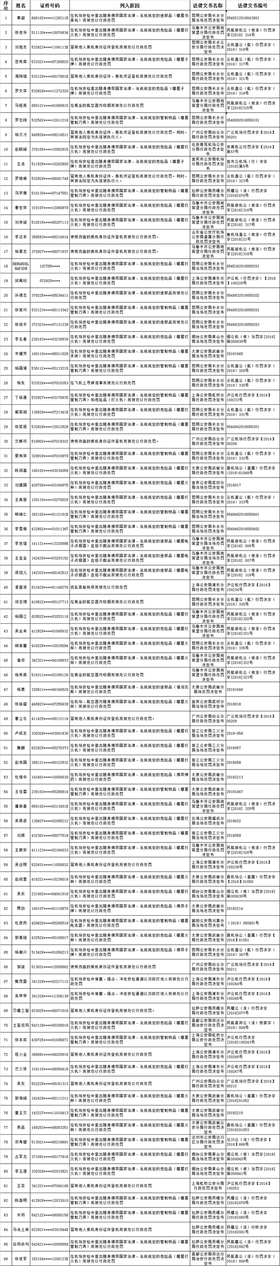 民航公布86人“黑名单” 今起限制乘坐民航1年