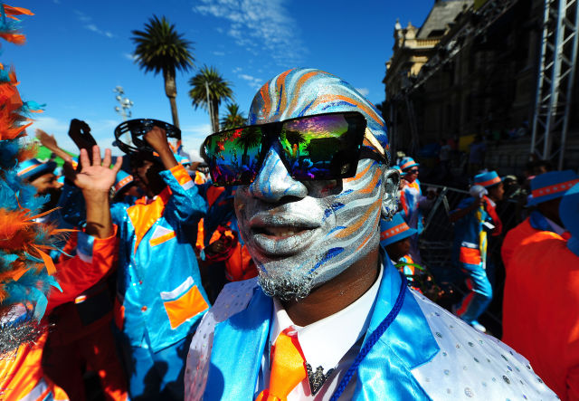 2017年1月2日,南非开普敦,一年一度的吟游诗人游行。该游行可上溯至19世纪中叶,人们装扮成吟游诗人,打着阳伞,弹着班卓琴,且歌且舞行进以示庆祝。Henk Kruger/南非独立传媒集团