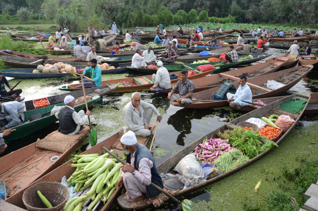 2016年8月6日,达尔湖上满载蔬菜的小船,人称漂浮的市集。Nissar Ahmad/印度教徒报