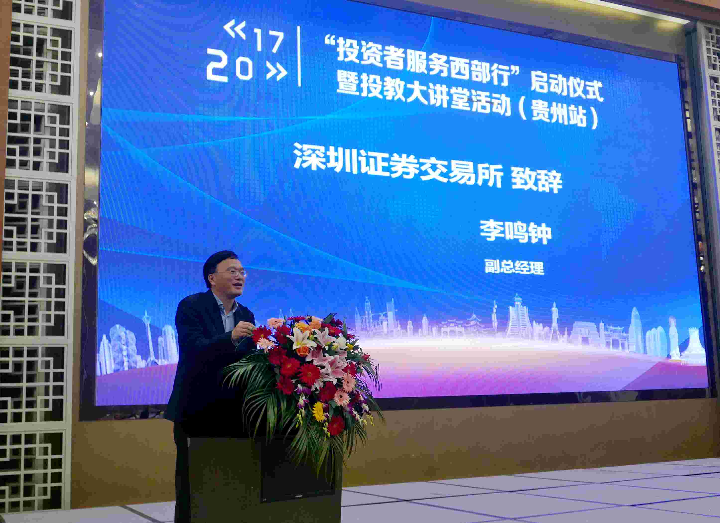 深交所副总经理李鸣钟在“投资者服务西部行”启动仪式暨投教大讲堂活动(贵州站)上发言。