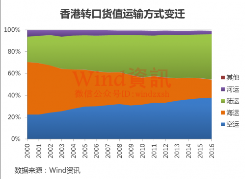 从转口货物运输方式的变迁来看,作为三面环海的香港而言,海运当仁不让的占据重要地位,但随着经济的发展,海运所占的比重逐渐下滑,从2000年时的占比50%左右下滑至当前的10%。而空运和陆运所占比例同步增长,挤占了海运下滑的市场份额。