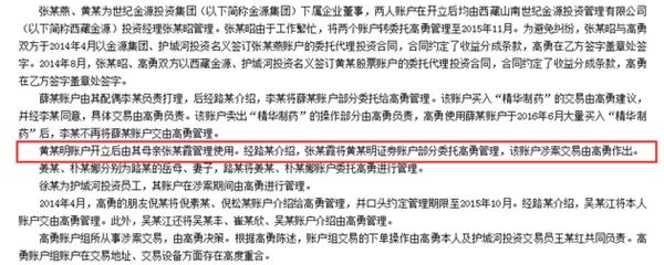 决定书中对于案件细节的通报显示,上述十四个委托交易账户其中之一,为黄某明账户开立后由其母亲张某霞管理使用,并经过护城河投资另一个合伙人路某介绍,张某霞将黄某明账户交由部分委托高勇管理,该账户涉案交易由高勇作出。