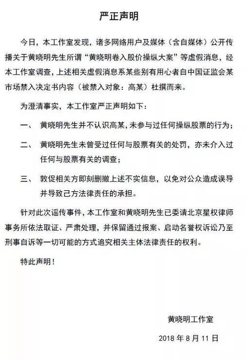 对此,黄晓明工作室发表严正声明称,黄晓明并不认识高勇,也未参与过任何操纵股票行为和介入过任何相关调查,并表示上述提到的媒体报道为杜撰而来,将追究法律责任。