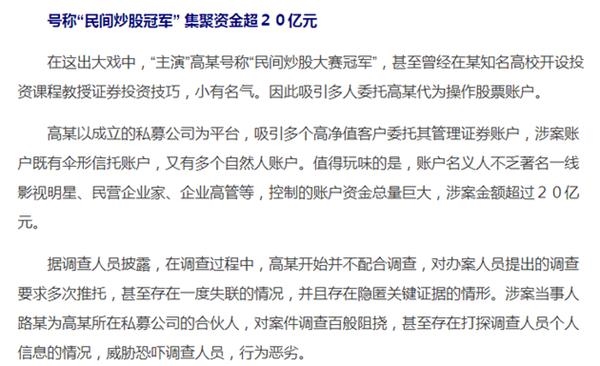 时间再拉回到现在,据新华社3月16日报道,高某以成立的私募公司为平台,吸引多个高净值客户委托其管理证券账户,涉案账户既有伞形信托账户,又有多个自然人账户。值得玩味的是,账户名义人不乏著名一线影视明星、民营企业家、企业高管等,控制的账户资金总量巨大,涉案金额超过20亿元。