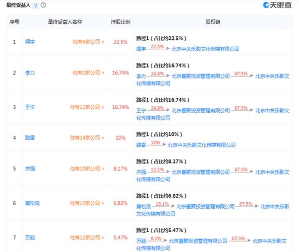 天眼查数据显示,路雷旗下公司14家,除了投资公司外,还有影视传媒公司。值得注意的是,在一家注册资本为555.56万人民币的北京中关乐影文化传媒有限公司中,路雷与上市公司神州泰岳(300002.SZ)股东及高管关系密切。根据天眼查数据,2012年,路雷与北京善聚投资管理有限公司合伙成立了北京中关乐影文化传媒有限公司,善聚投资背后股东即为神州泰岳实际控制人王宁、李力以及众多高管。