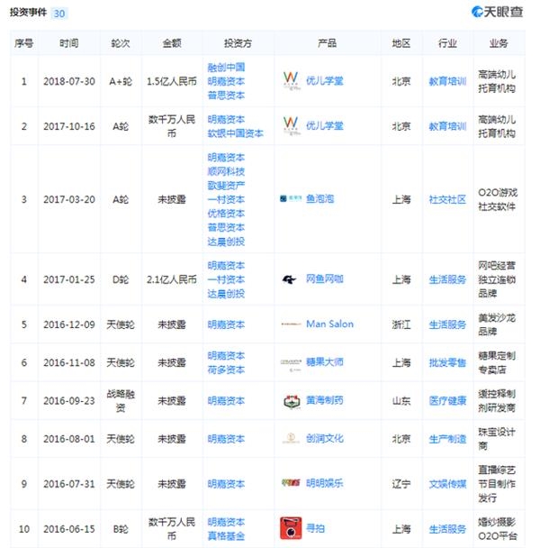 自2015年组建团队,明嘉资本先后投资了同道文化(同道大叔)、火辣健身、野马现场、火乐科技(坚果)、芭比辣妈、第1车贷、寻拍、一下科技等众多项目。明嘉资本最新的投资事件是2018年7月30日,联手融创中国、普思资本共同参与优儿学堂A+轮1.5亿融资。