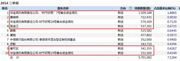 在长生生物2014年三季报中,前10大流通股东与前述证监会披露的账户名高度相似,“时节好雨”信托、“黄晓明”、“吴宝江”、“崔可欣”赫然在列。6个账户合计持股超过400万股,且都是新晋前十大流通股东。