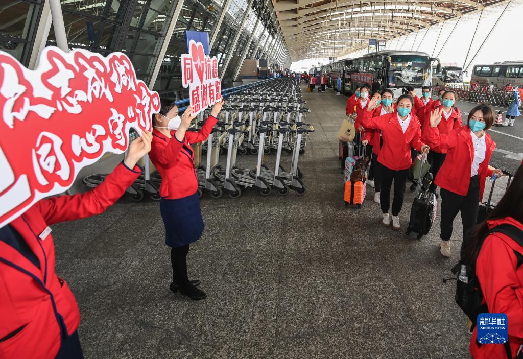 重庆市援沪医疗队队员在进入上海浦东国际机场候机楼时向手举送行标牌的工作人员挥手道别(5月25日摄)。当日,重庆市援沪医疗队1560余人完成使命撤离上海。新华社记者 李贺 摄