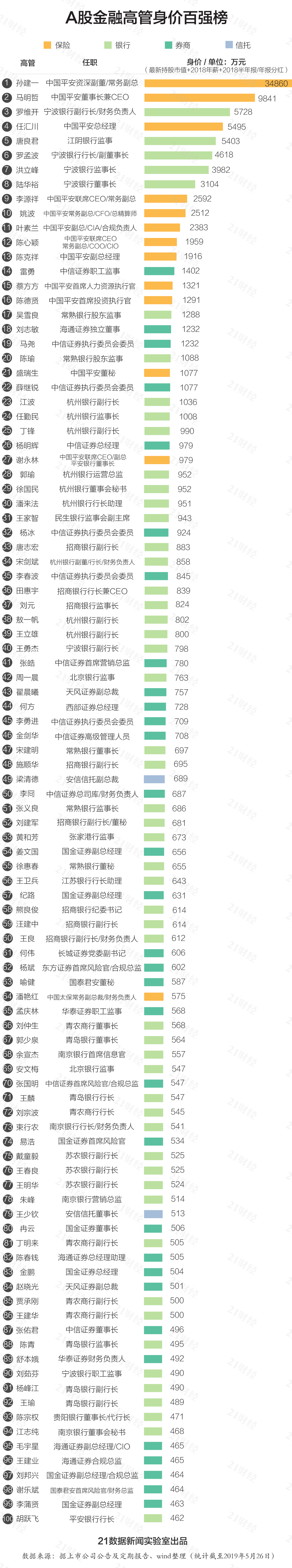 21数据新闻实验室统计发现,A股金融高管中财富百万的达659人,占比近半,其中9成来自券商及银行,保险51人,信托7人。