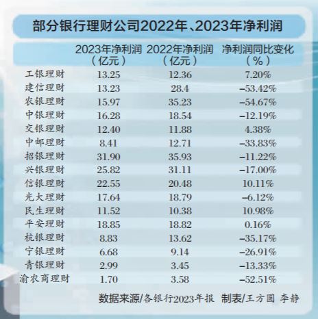 在规模没有得到明显增长和响应减费让利号召的背景下,行业经营业绩整体出现下滑,部分公司更是出现“增量不增收”的窘境。中国证券报记者梳理多家银行年报发现,2023年,中邮理财、兴银理财、青银理财、中银理财、招银理财净利润均较2022年减少超10%,农银理财、建信理财、渝农商理财净利润均较2022年减少超50%。