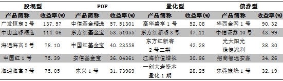 就单只产品而言,混合型的广发恒定3号、中山宝睿精选涨幅均超过了100%,分别为137.57%、114.06%;债券型的华西金网2号紧随其后,净值大涨90.32%;股票型产品则以海通海富5号、海通海富7号表现居前,分别上涨78.10%、75.05%;FOF产品中的中信基金精选、东方红基金宝涨幅也均超过了50%;高华盛享1号则成为量化型产品中的领头羊,涨幅达到了52.08%。