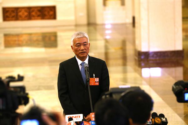 科技部部长王志刚在“部长通道”接受记者采访 车亮 摄