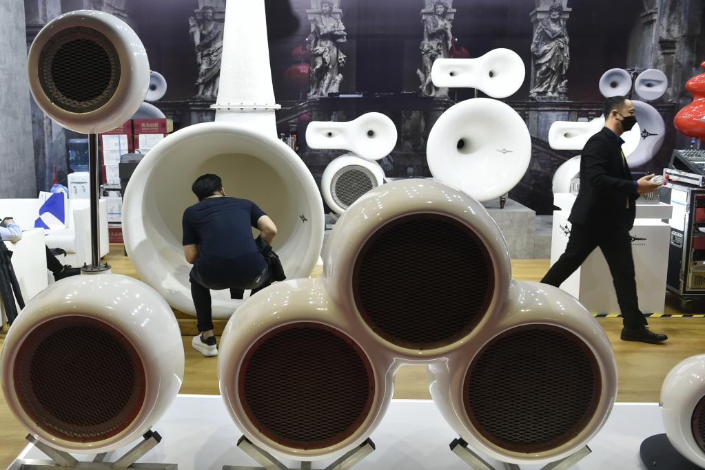 11月6日,参会者在第四届进博会展馆里的意大利PEQUOD公司展位参观音响设备。PEQUOD公司首次参展进博会。(新华社记者鲁鹏摄)