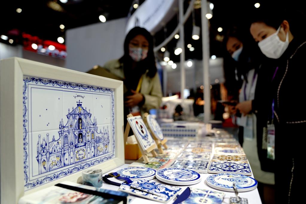 11月6日,观众在进博会参观澳门文创展品。(新华社记者张建松摄)