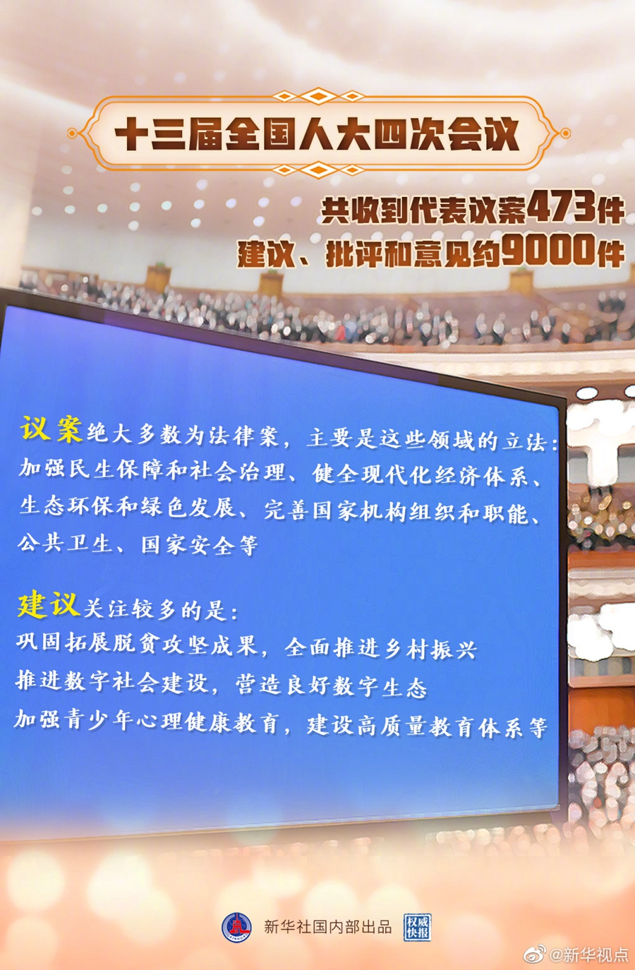 根据大会主席团决定的代表提出议案的截止时间,到3月8日12时,十三届全国人大四次会议秘书处共收到代表提出的议案473件。此外,目前大会秘书处收到代表提出的建议、批评和意见约9000件。代表们的议案、建议都集中在哪些方面?(记者杨维汉、罗沙、王琦)