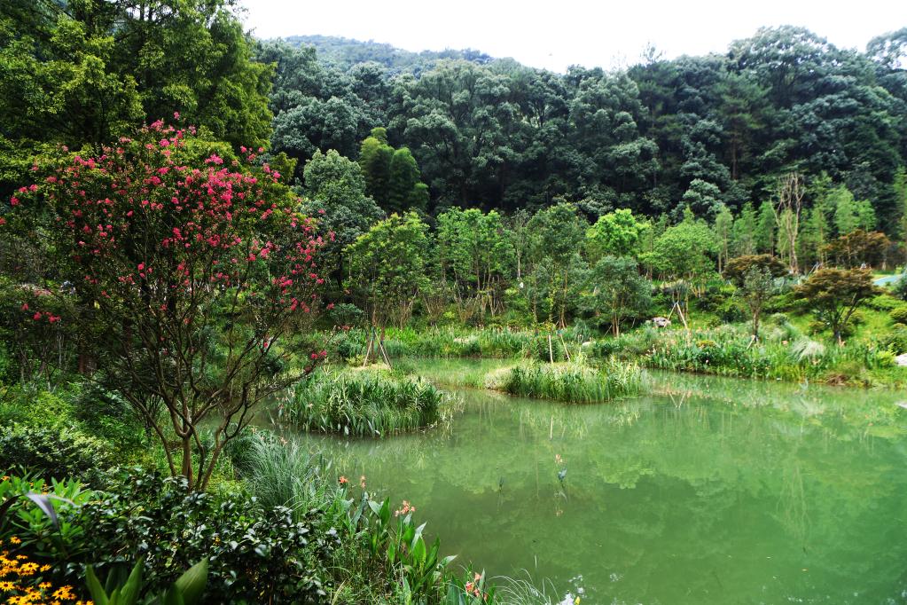 在缙云山山腰处的生态修复点“雨鸣涧”,山石围成层层小池,涓涓山泉顺池而下,池边各类草木繁盛,仿佛置身“巴山夜雨涨秋池”的诗情画意中。