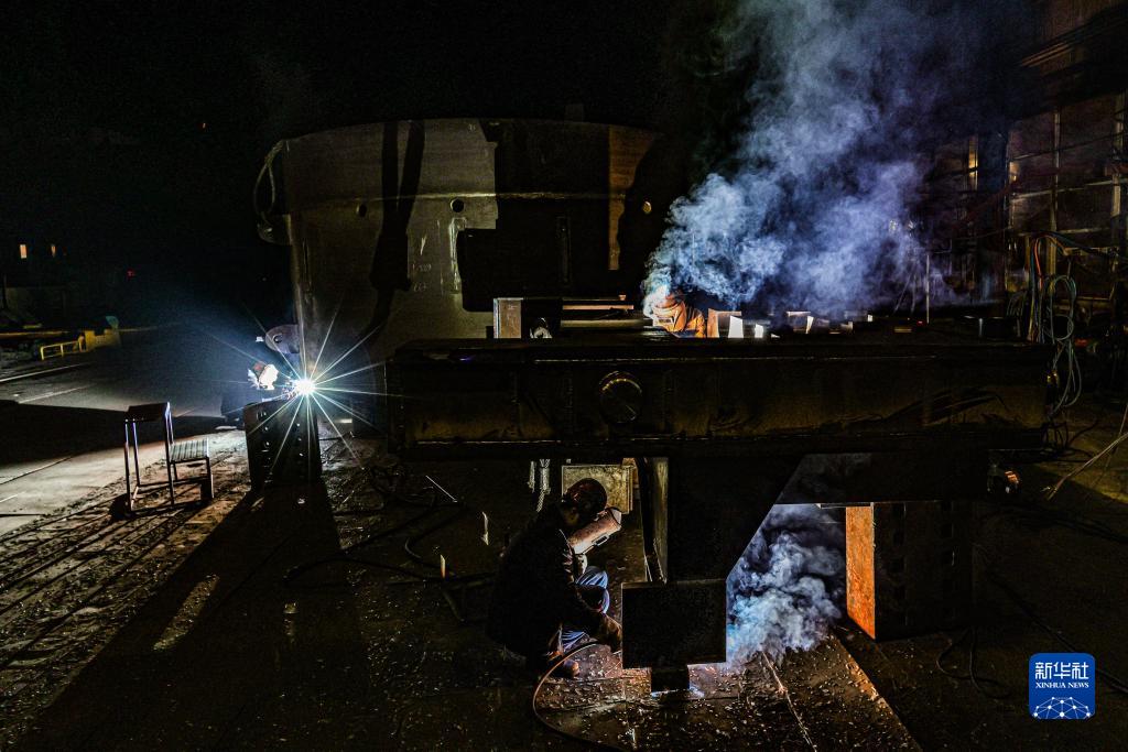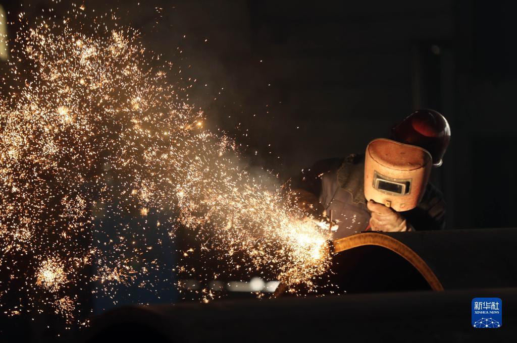 在沈阳北方重工集团有限公司,工人在车间焊接产品(2022年3月24日摄)。 新华社发