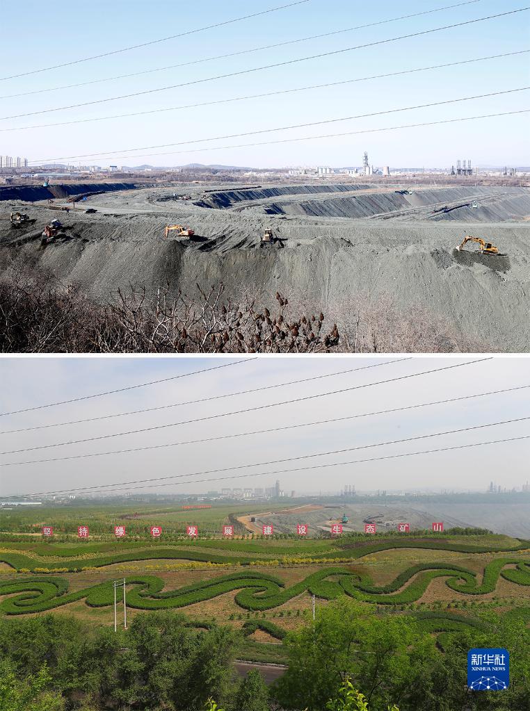 拼版照片:上图为辽宁省抚顺市西露天矿部分区域生态恢复前的场景(2019年3月6日摄,资料照片);下图为辽宁省抚顺市西露天矿部分区域生态恢复后的场景(新华社记者杨青2022年6月2日摄,无人机照片)。新华社发