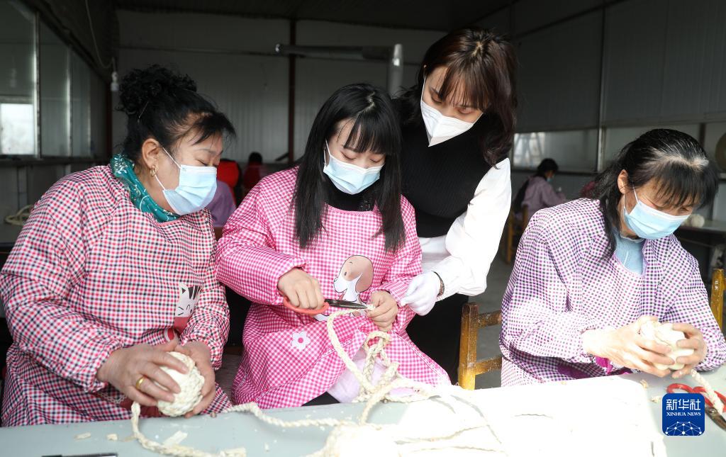 在辽宁省鞍山市台安县高力房镇乔坨村,妇女在当地脱贫产业项目支持的工艺品厂里工作(2021年3月4日摄)。新华社记者 蔡湘鑫 摄