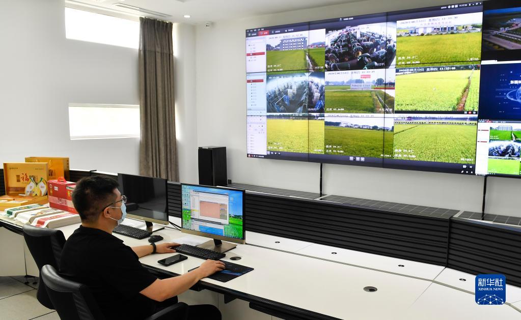 在吉林省吉林市昌邑区大荒地村东福米业现代农业信息化监视指控中心,工作人员通过监控系统查看稻田情况(2020年8月13日摄)。新华社记者 许畅 摄