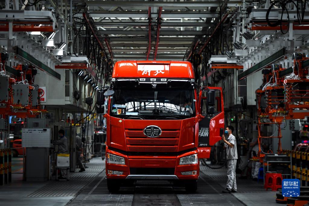工人在吉林省长春市一汽解放总装车间装配车辆(2022年6月15日摄)。新华社记者 许畅 摄