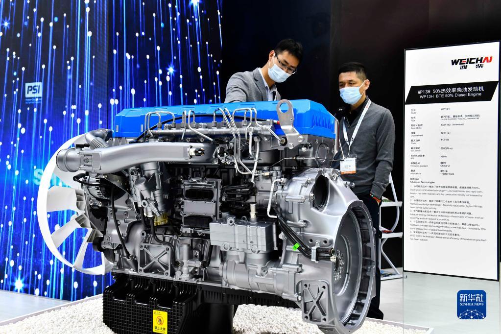 在山东济南召开的第二届世界内燃机大会上,潍柴集团展示的高热效率柴油发动机(2021年4月21日摄)。新华社记者 郭绪雷 摄