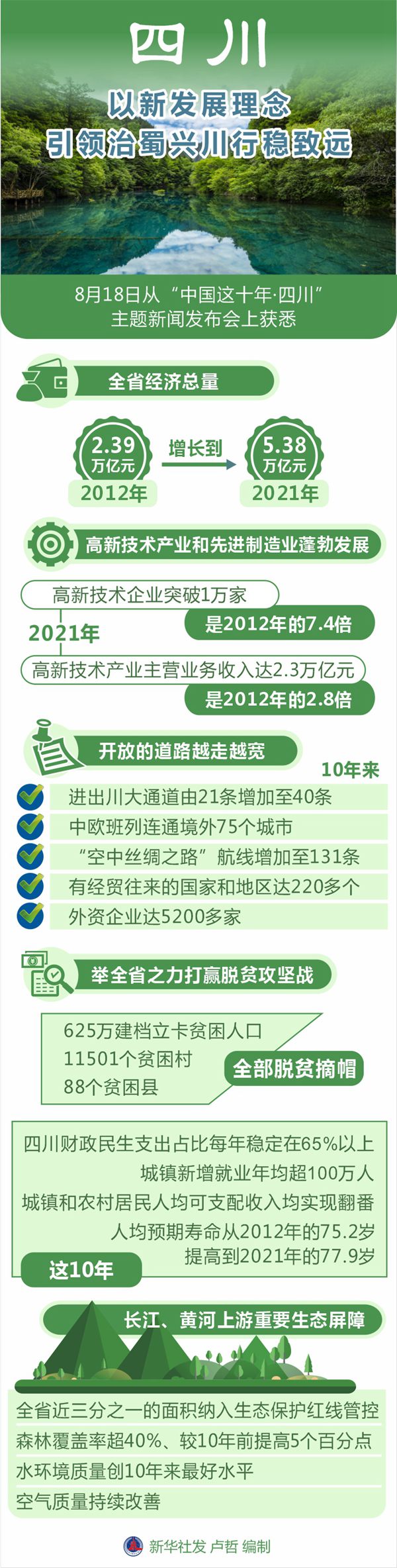 新华社成都8月18日电(记者胡旭)记者从18日举行的“中国这十年·四川”主题新闻发布会上获悉,党的十八大以来,四川深入学习贯彻习近平总书记重要指示精神,以新发展理念引领高质量发展,砥砺前行、奋发进取,治蜀兴川各项事业取得新的重大成就。
