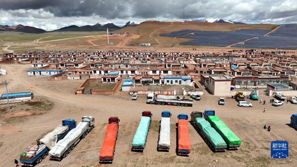 在西藏那曲市双湖县多玛乡仲鲁玛村,运输家具的货车整装待发(2022年7月13日摄,无人机照片)。新华社记者 晋美多吉 摄