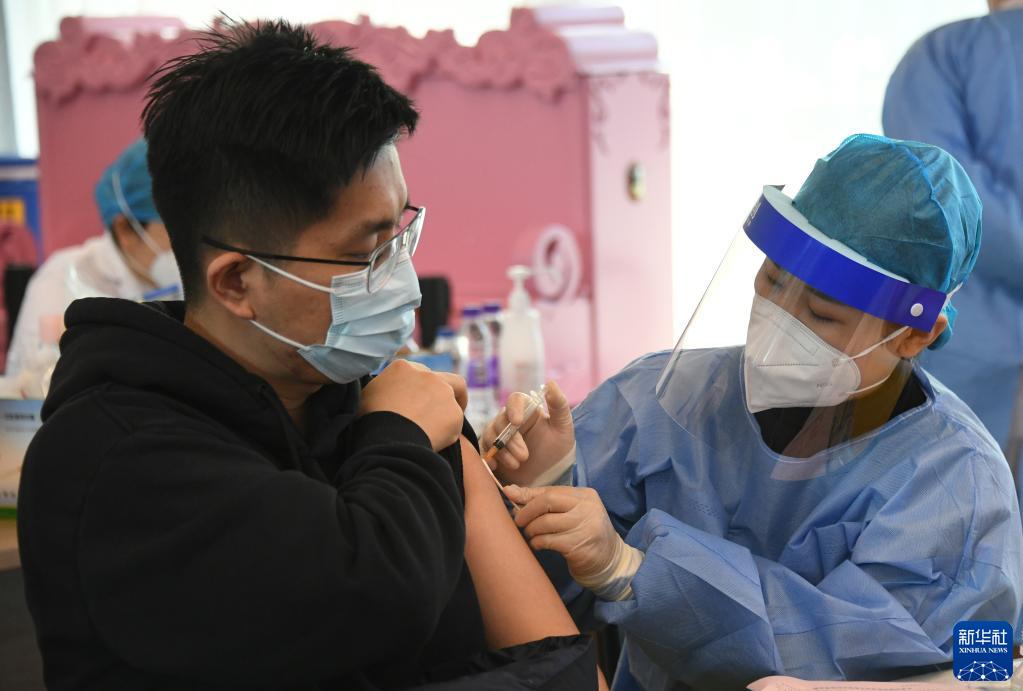 2021年12月7日,北京市海淀区上地街道组织医护人员来到海国瑞业科技园,为园区内的企业员工进行新冠疫苗加强针接种。新华社记者 任超 摄