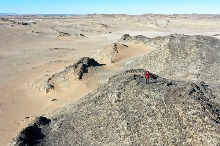 2021年1月,尼玛老人在戈壁石山上眺望边境线。新华社记者 连振 摄