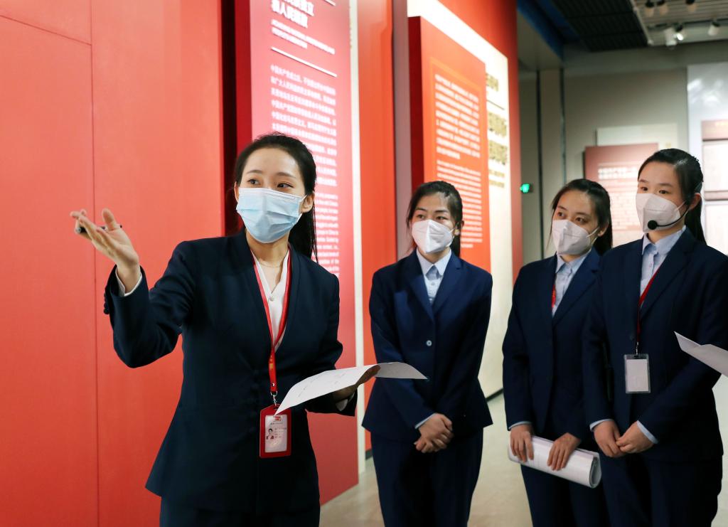 6月29日,张欣怡(左一)与中共一大纪念馆的宣教专员们在馆内进行讲解演练。新华社记者 刘颖 摄