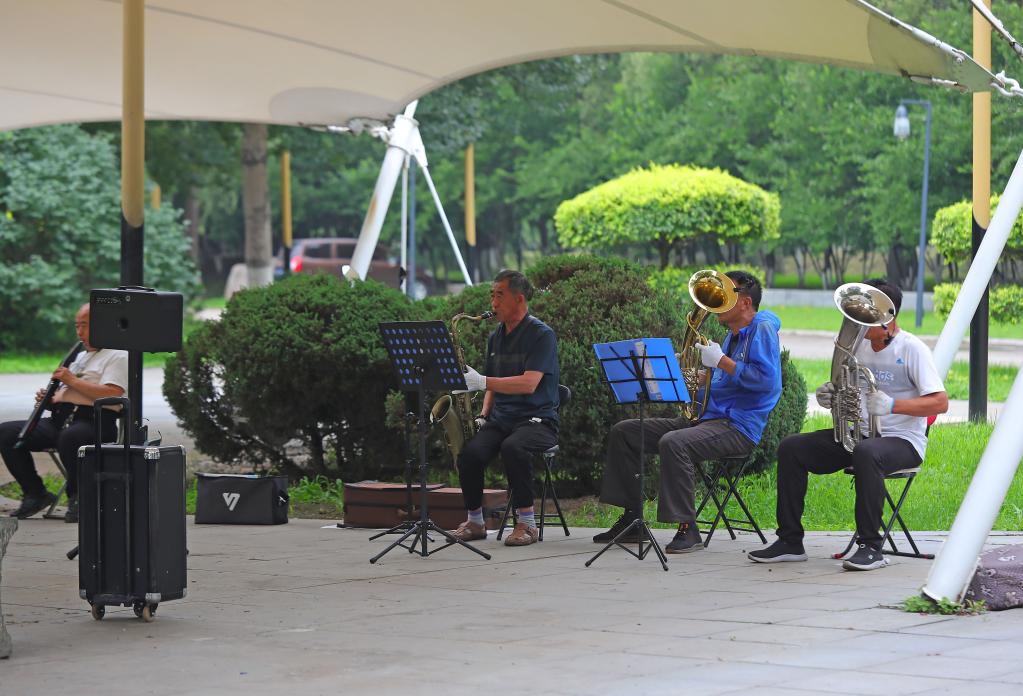 7月5日,市民在细河U谷公园内演奏乐器。新华社记者杨青摄