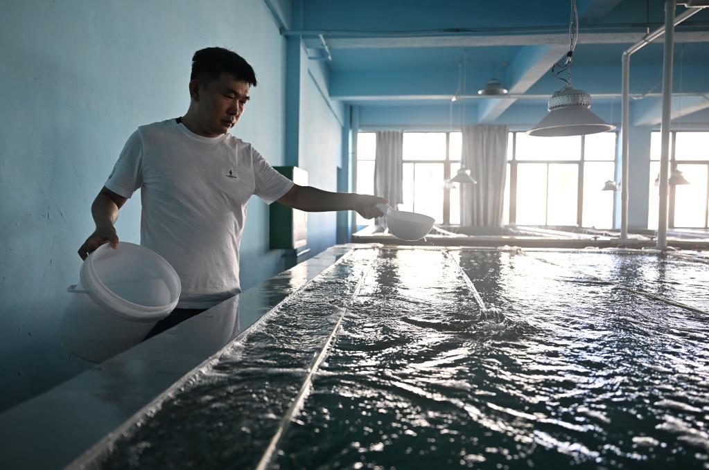 养殖户曾广能在文昌冯家湾现代化渔业产业园养殖示范厂房里给鱼苗喂食。新华社记者郭程 摄