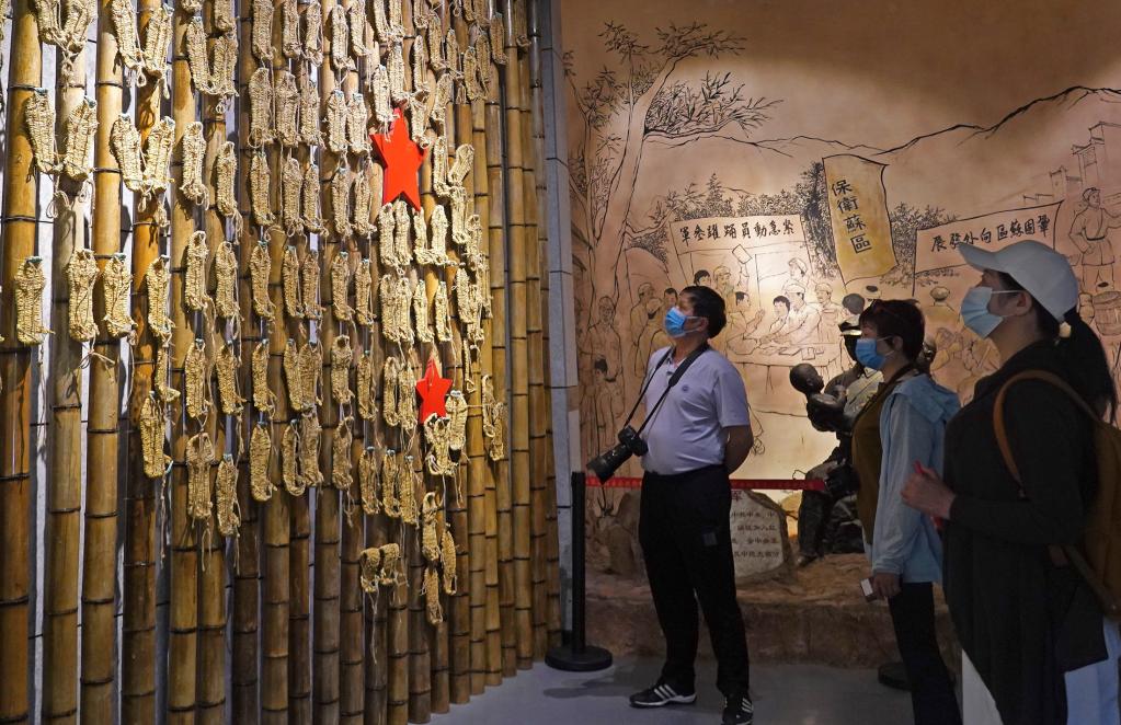 在江西省于都县中央红军长征出发纪念馆,游客参观草鞋组成的“草鞋墙”(2021年4月30日摄)。新华社记者万象摄