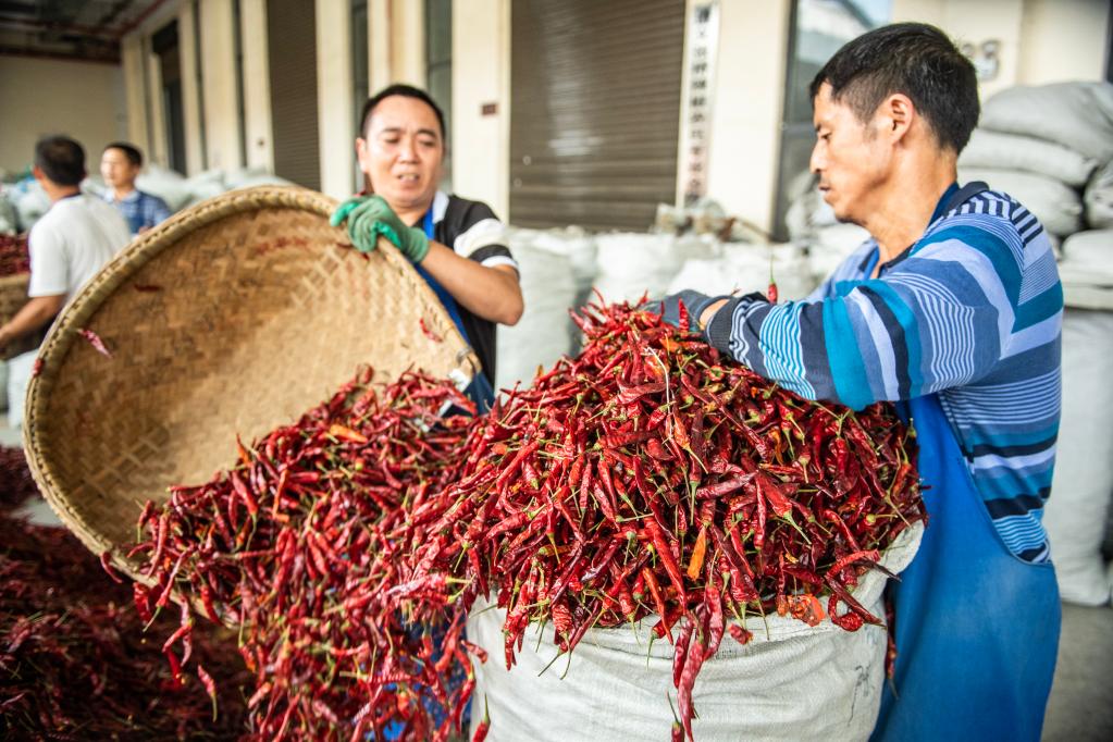 工人在遵义市新蒲新区中国辣椒城将辣椒装袋(2021年8月29日摄)。新华社记者陶亮摄