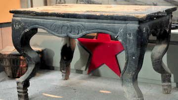 金寨县革命博物馆展示的穿石庙会议桌。 新华社记者 白斌 摄