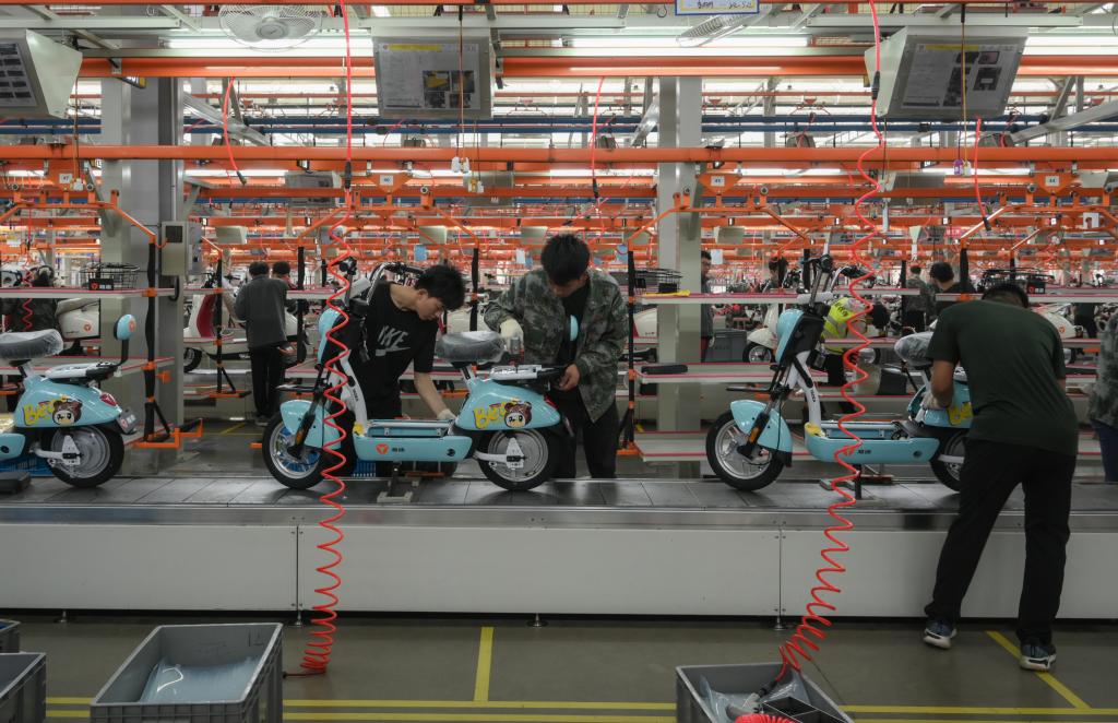 安徽雅迪机车有限公司生产车间内,工作人员正在组装电动机车。詹杨 摄