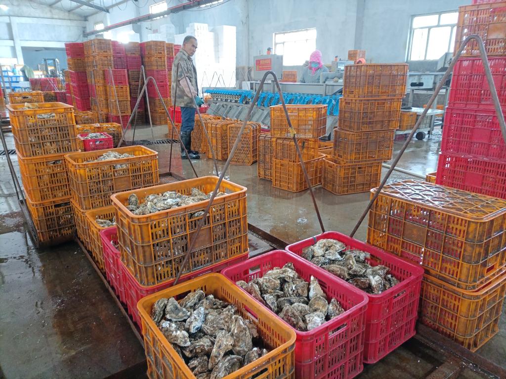 初步清理后的生蚝被送进公司在岛上的厂房里,经过自动化的清洗、按重量分拣等程序,保温打包后发往全国各地。
