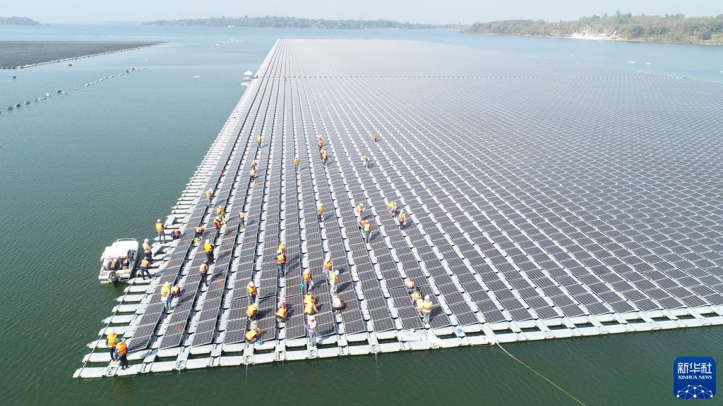 2021年1月23日,施工人员检查中泰两国联合承建的泰国乌汶府诗琳通大坝综合浮体光伏项目的太阳能板安装情况。新华社发(泰国国家电力局项目组供图)