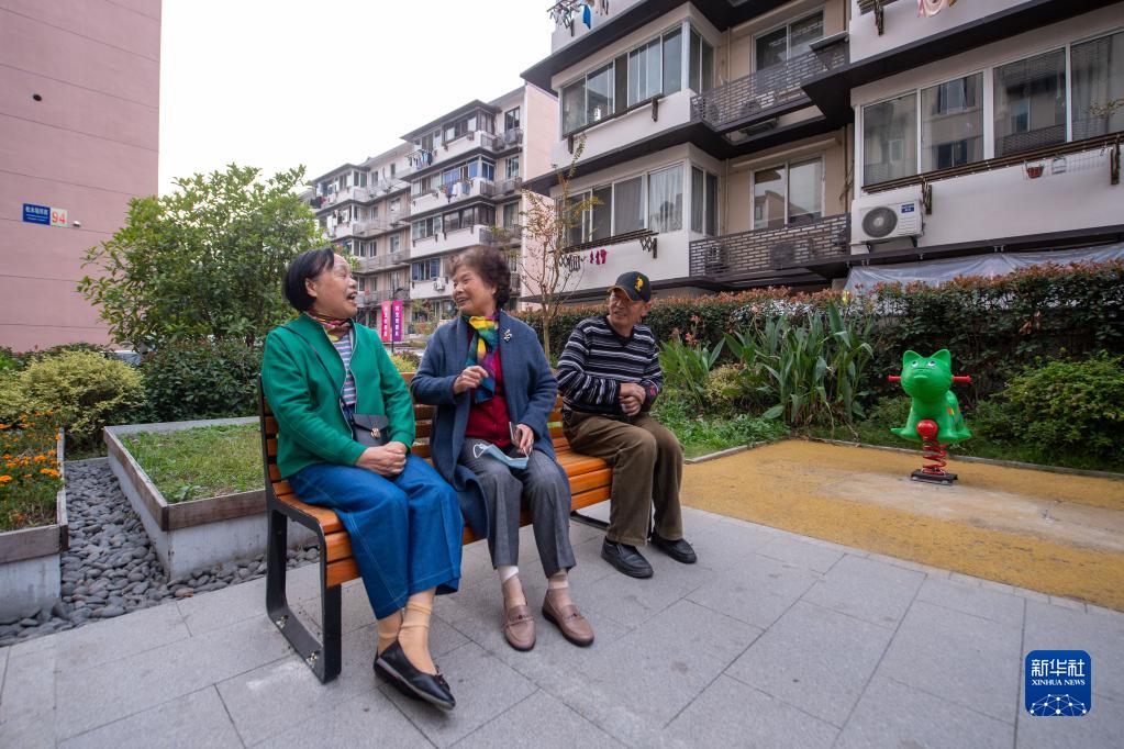 浙江省杭州市西湖区北山街道松木场社区的居民在老旧小区改造后建成的休闲场地聊家常(2022年11月1日摄)。新华社记者 江汉 摄