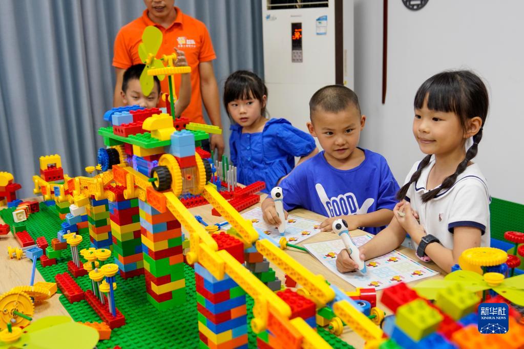 在重庆丰都县高家镇汶溪社区党群服务中心内,几名加入家庭教育互助会的孩子在体验儿童机器人课程(2022年8月24日摄)。丰都县的乡村、社区家庭教育互助会致力于服务丰都外出务工家庭及留守儿童。新华社记者 刘潺 摄