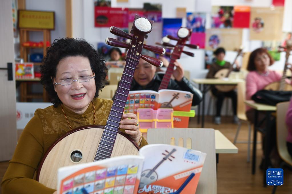 在浙江省嘉兴市南湖区桂苑社区的老年大学活动室内,老人们在老师的指导下学琴(2023年3月7日摄)。新华社记者 徐昱 摄
