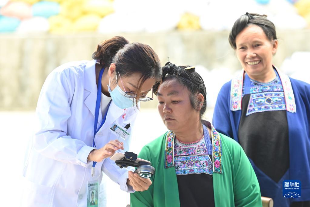 在广西融水苗族自治县白云乡帮阳村,来自广东医科大学附属医院的李芳谷博士(左)在“送医进苗寨”活动上给村民提供医疗服务(2022年10月26日摄)。新华社记者 黄孝邦 摄