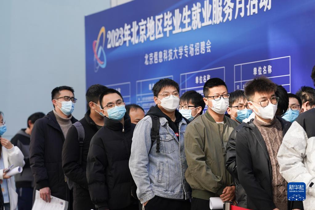 在北京信息科技大学,求职学生排队等候进入招聘会现场(2023年3月1日摄)。新华社记者 鞠焕宗 摄