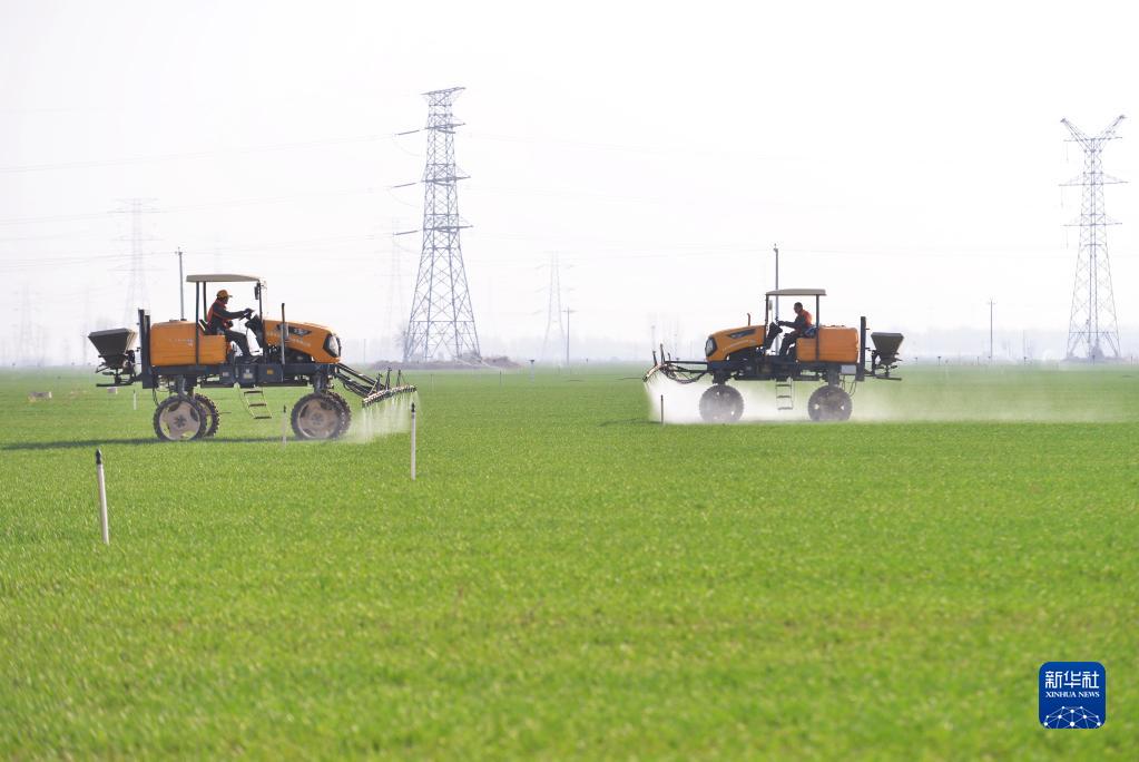 河北省晋州市槐树镇北白水村一家农业合作社的社员操作农业机械给冬小麦喷洒农药(2023年3月14日摄)。新华社记者 杨世尧 摄